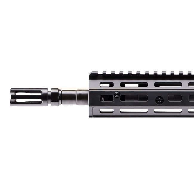 • Vernietet und angeschweißter, verlängerter Daniel Defense Flash Suppressor, 17-4 PH Edelstahl, salt-bath nitriert (werksseitig montiert).