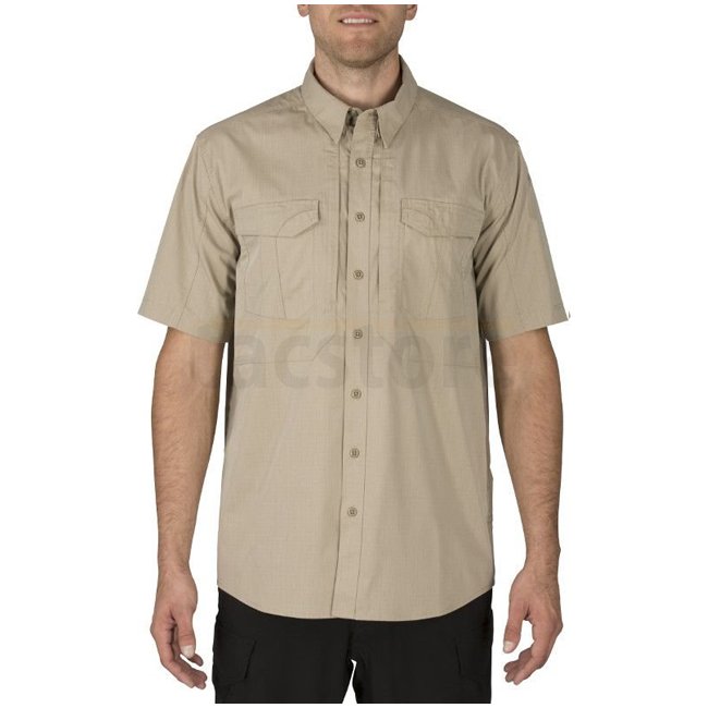 5.11 Stryke Shirt Short Sleeve in Khaki, available in 2XL. Lightweight and durable with 62% Polyester and 38% Cotton blend fabric. Ideal for outdoor and tactical use.
