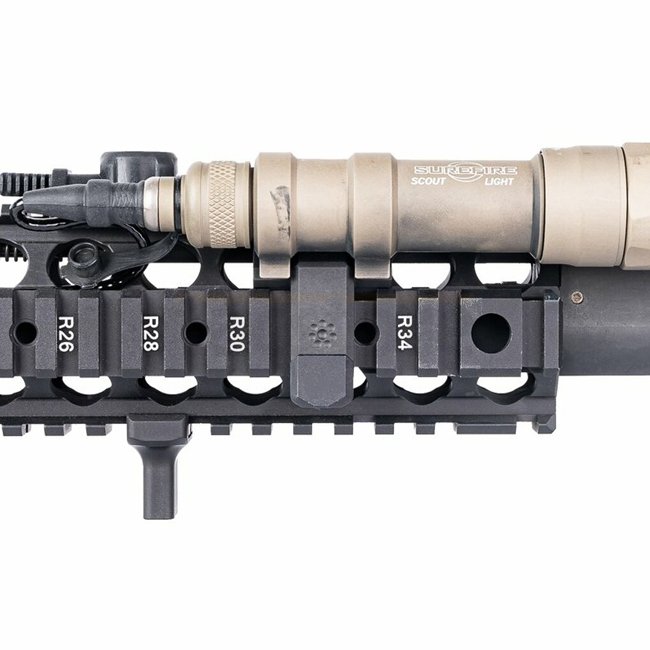 When used on the side mounting surfaces, the Offset Scout Mount places the light at a 45 degree angle and tucks it in closer to the handguard. Oriented upwards, the light is located at approximately the 1:30 or 10:30 clock positions. Oriented downwards, the light is located at approximately the 4:30 or 6:30 clock positions.
