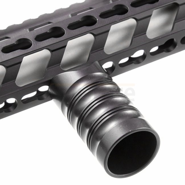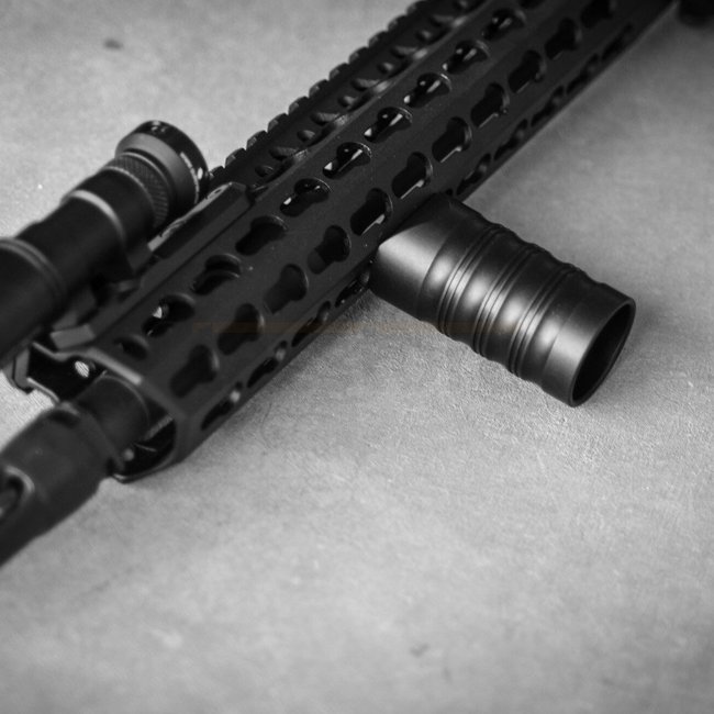 The Arisaka Vertical Grip is a robust, minimal grip for KeyMod handguards. It features a radiused profile at the top which tapers to meet the mounting surface on the handguard, giving a low-profile feel and ergonomic comfort. Twin mounting screws ensure secure attachment. The grip is hollow, with no end-cap.