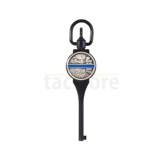 ASP Blue Line G2 Extended Handcuff Key is a high-quality and durable handcuff key with a 360° swivel key for easy use. It is precisely machined and heat treated for strength, featuring a BackSet tab for quick keyway location. This key pays tribute to law