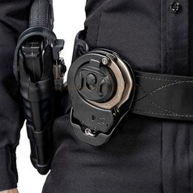 The Exo-S Case is a sleek, lightweight, rapid-access carrier, custom-designed specifically for ASP Ultra Cuffs. It gets its name from a lightweight, exoskeleton-like design that adds virtually no bulk, and has no covers, flaps, or straps to get in the way. Also, unlike any other handcuff case, the Exo-S holds the handcuffs in a proper, pre-loaded ''ready'' configuration, preventing the bows from being moved out of position while carrying. To deploy handcuffs, simply release the slide lock and remove the restraints. To replace, just seat the bottom of the cuffs into the rubber-cushioned/noise-dampened recess, and re-engage the slide lock. Each case incorporates an integral back pocket for an auxiliary handcuff key. Belt loop and MOLLE compatible.
