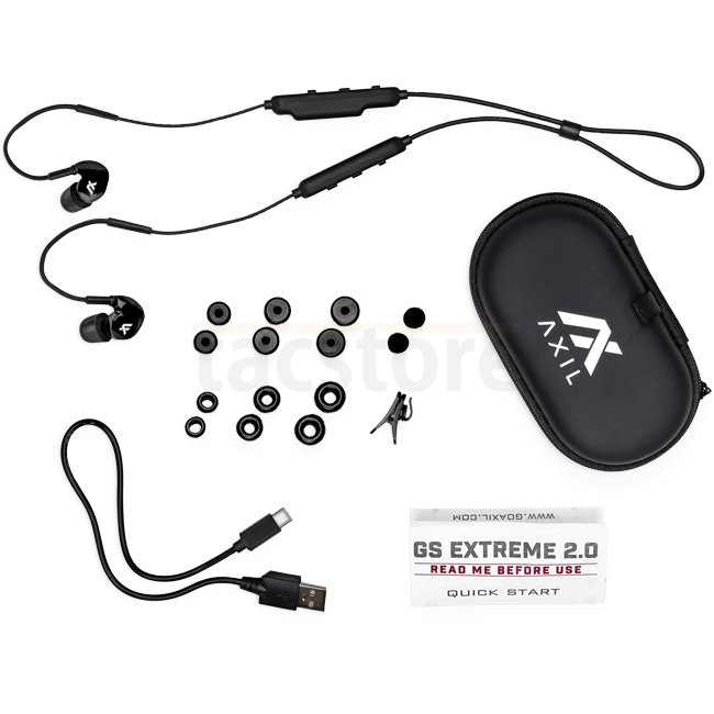 Axil GS Extreme 2.0 - Black: Sound enhancement & hearing protection. Premium dynamic speaker, 25 hours hearing enhancement run time, 9 hours audio run time, 8 hours with both features. Bluetooth 5.0, 0 HZ - 40'000 HZ sound spectrum, 29 DB SNR with max pro