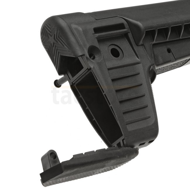 • Storage compartment in the tip of the stock, accessible through the rubber stock pad
