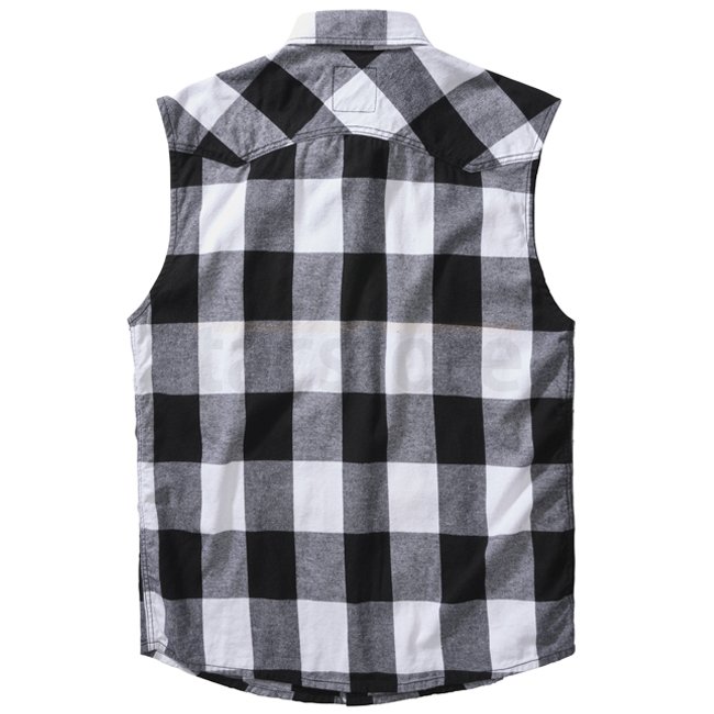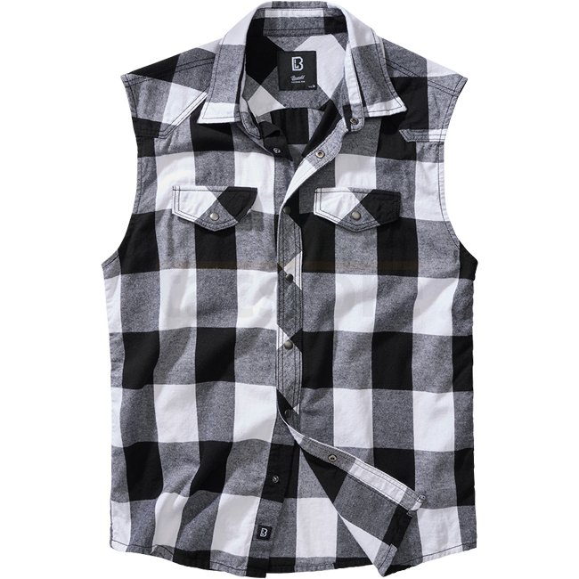 A stylish and comfortable white and black sleeveless check shirt by Brandit. Made of skin-friendly cotton with two breast pockets and a lumberjack look.