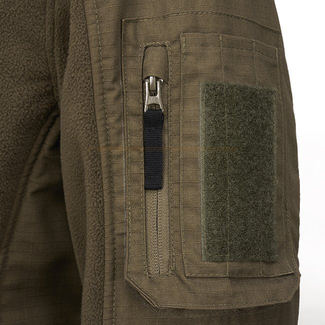 Brandit Fleecejacket Ripstop - Olive - L. Robust, functional, water-repellent fleece jacket with multiple pockets, zipper compartments, and Velcro areas for customization. Adjustable hem, longer back, and chin protection. Shell 1: 100% polyester, Shell 2: