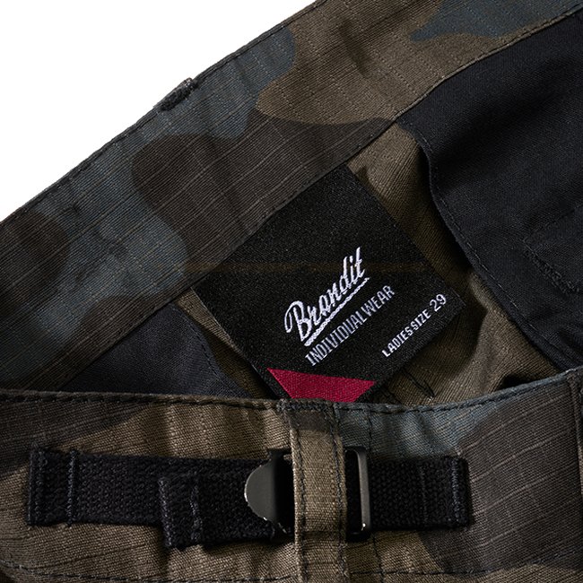 Brandit Ladies BDU Ripstop Trousers in Darkcamo for size 36. Water-repellent, easy-care material with adjustable waist, reinforced knees, and multiple pockets. 100% cotton, with drawstring at the leg end.
