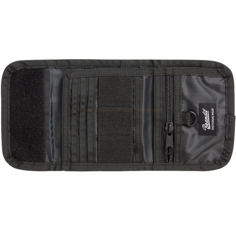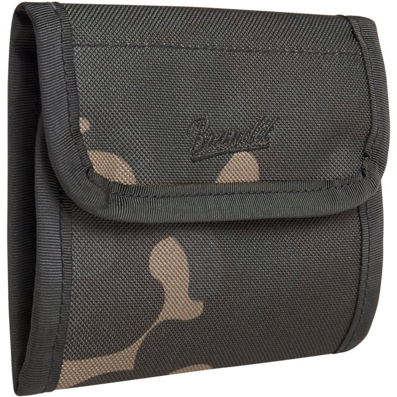 Brandit Wallet Five in Dark Camo features robust polyester material, coin compartment, card slots, mesh pocket, and more for organized storage.
