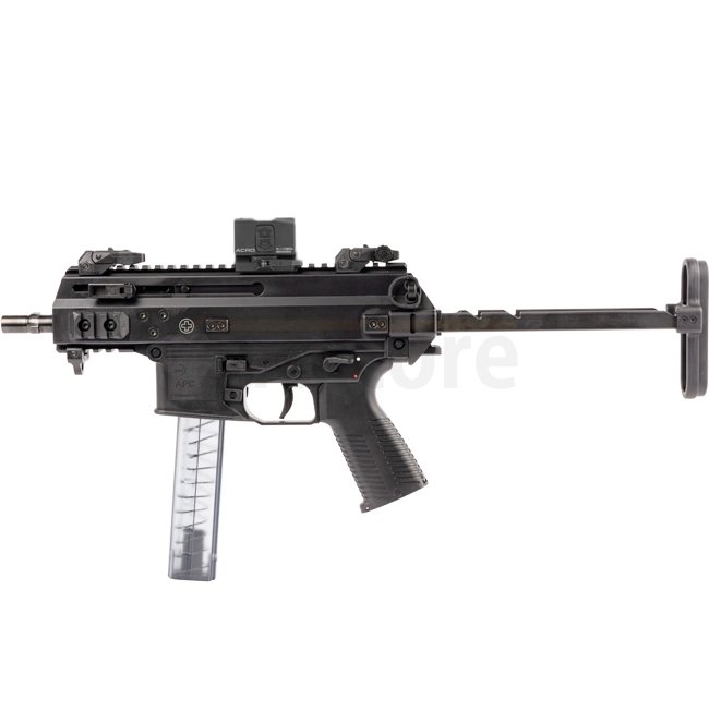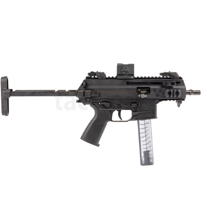 The B&T APC9 K PRO is a compact semi-automatic carbine chambered in 9x19mm. Optimized for tactical applications, it features a telescopic stock, ambidextrous controls, and a 3-lug suppressor interface. It is designed to accept standard APC9 / MP9 / TP9 magazines and comes fitted with an Aimpoint® ACRO P-1 red-dot sight for precise target engagement.