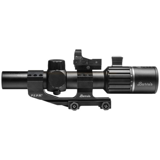 The Burris RT-6 1-6x24 Riflescope Tactical Kit is a versatile scope perfect for tactical shooting. The kit includes an AR-P.E.P.R. QD Scope Mount and FastFire 3 (3 MOA) for quick target acquisition. This scope offers 1-6x magnification, a 30mm objective l
