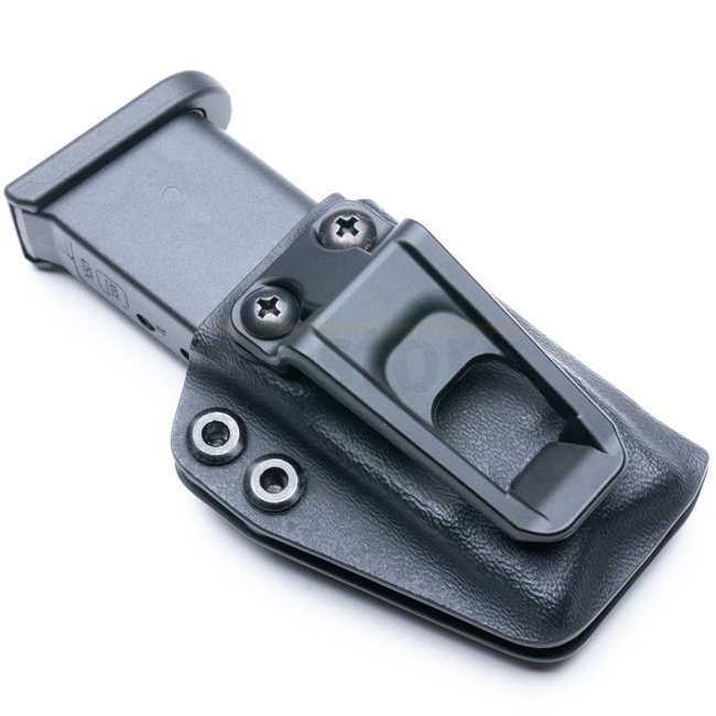 The Crucial Concealment Covert Mag Holder is a versatile and durable magazine pouch designed for both inside-the-waistband (IWB) and outside-the-waistband (OWB) carry. Its ambidextrous design allows for easy conversion to suit various carry positions, providing flexibility and convenience for users. Constructed from .080" Kydex, this mag holder offers a thin, low-profile form without compromising durability.