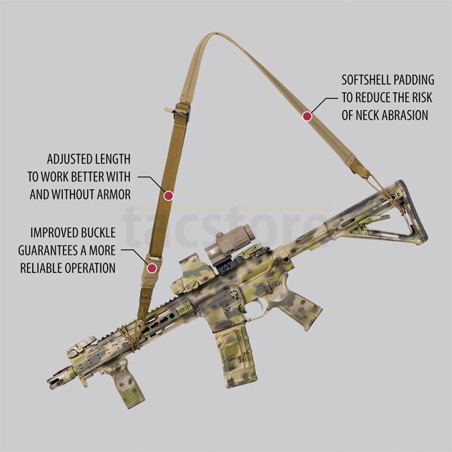 Improved version of our carabiner sling. It remains lightweight, optimized for use as a 2-point, it is easily convertible to a single-point configuration. Durable, soft to the touch softshell neck area prevents abrasion, even with prolonged use. New version, low failure rate buckle.