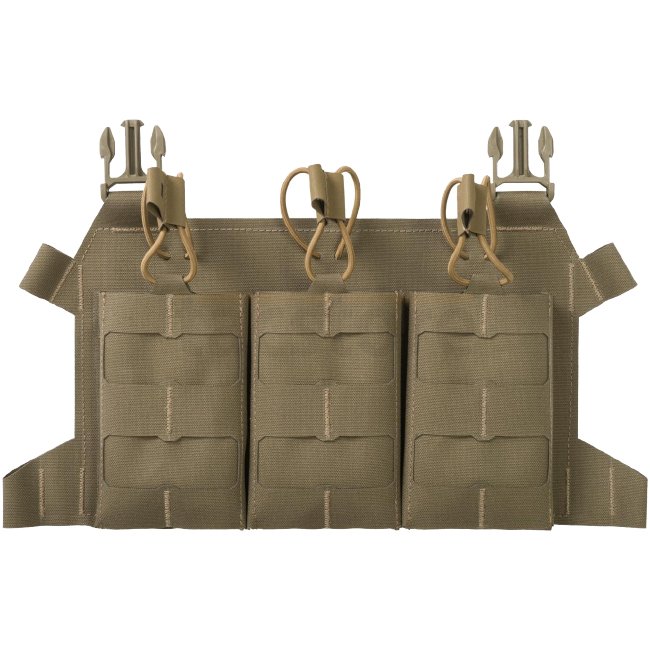 Advanced, skeletal flap for our plate carriers, especially BEARCAT and SPITFIRE series. The flap is designed to fit up to three M4/AR15 style magazines. Magazines are secured from the top via bungie cord. Due to the skeletal construction, the flap is not only minimalistic, but also is one of the lightest modular flaps on the market. The flap is covered with laser cut modular system compatible with MOLLE/PALS. The flap can be attached to the carriers via top buckles. The flap can also be easily transformed into a compact chest rig via additional chest rig interface (available separately).