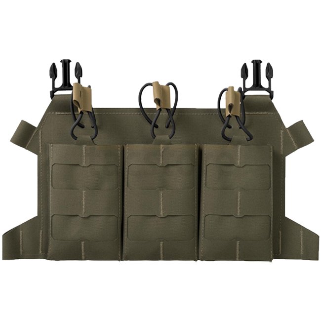 Advanced, skeletal flap for our plate carriers, especially BEARCAT and SPITFIRE series. The flap is designed to fit up to three M4/AR15 style magazines. Magazines are secured from the top via bungie cord. Due to the skeletal construction, the flap is not only minimalistic, but also is one of the lightest modular flaps on the market. The flap is covered with laser cut modular system compatible with MOLLE/PALS. The flap can be attached to the carriers via top buckles. The flap can also be easily transformed into a compact chest rig via additional chest rig interface (available separately).