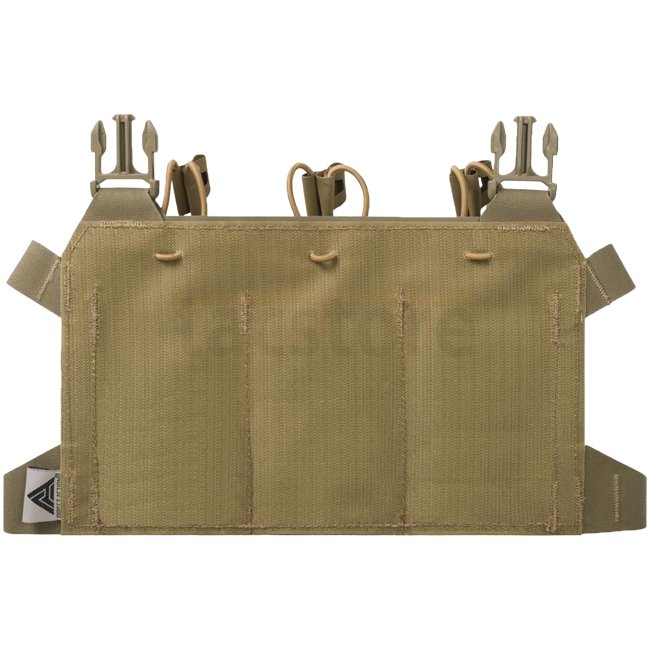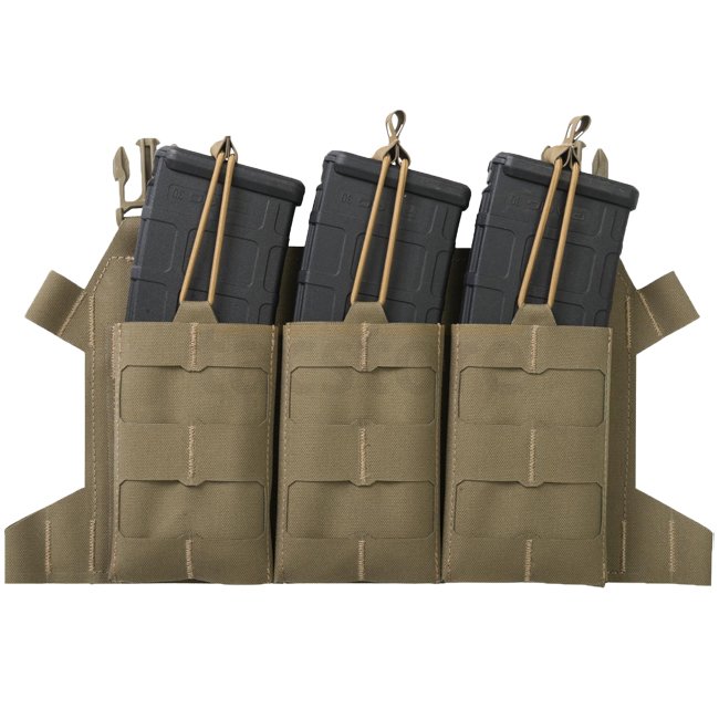 Minimalistic and lightweight skeletal flap for plate carriers, designed for up to three M4/AR15 style magazines. Secured via bungie cord and covered with laser cut MOLLE/PALS system. Can be easily attached to carriers or transformed into a compact chest r