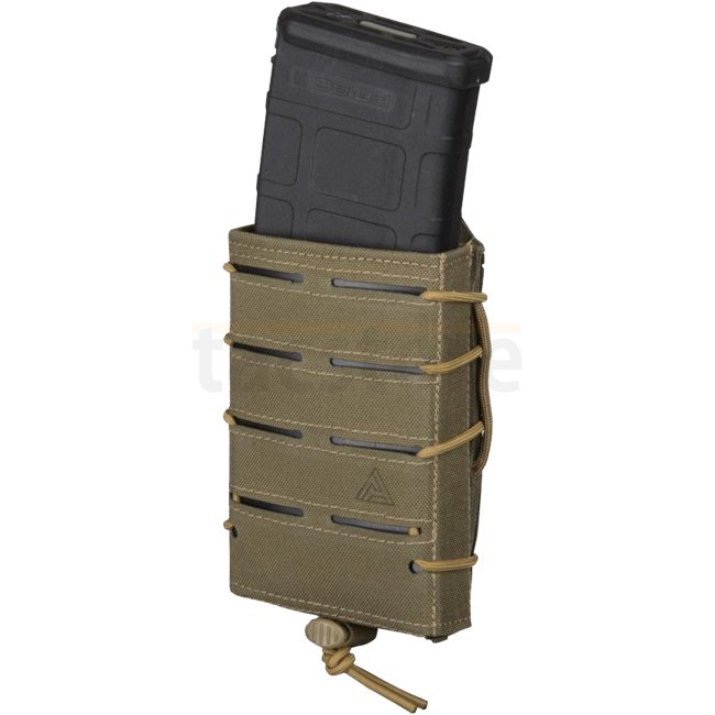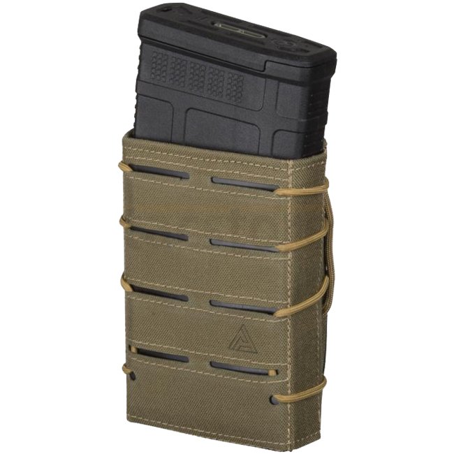 Open top rifle magazine pouch, designed for speed reloads but with secure magazine carry at the same time. The special internal material, combined with a limited-size top opening and tension-adjusting elastic cord, prevents the magazine from falling out if it gets snagged.