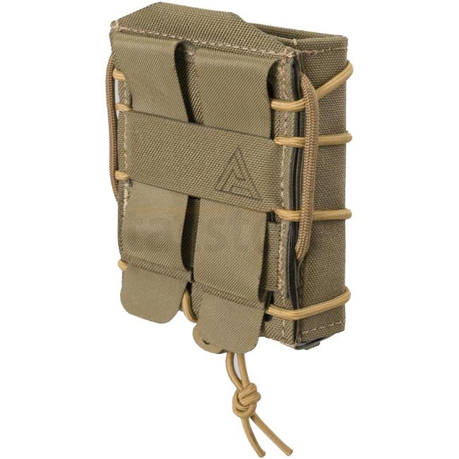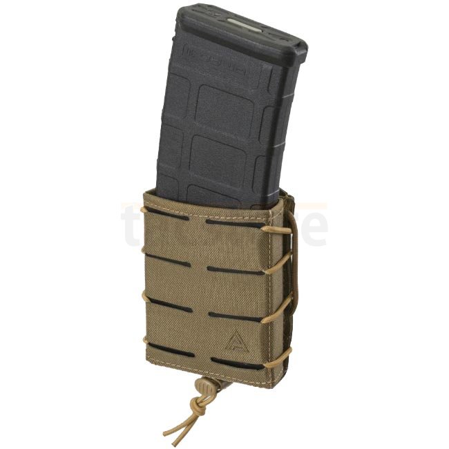 Shorter version of our open top rifle magazine pouch - the Speed Reload Pouch Rifle. The pouch was designed for rapid reloads, providing safe and sure magazine carry at the same time. The Hypalon on the internal side of the pouch, combined with a limited-size top opening and tension-adjusting elastic cord, prevents the magazine from falling out, even if it gets snagged. The shorter version not only seats better on belts and sleeves, but also position the magazine a little bit higher then the standard one.