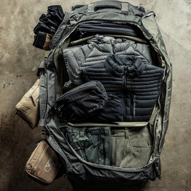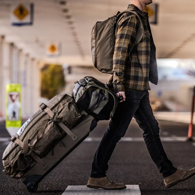 Eberlestock Atlas Duffel - Dry Earth: Rugged duffel for pros, adventurers, & tactical users. Spacious main compartment, 6 external pockets, lockable zippers. Hard shell bottom, wheels, internal compartments, rain fly. 95.77L, 5770g, 75cm x 41cm x 41cm.