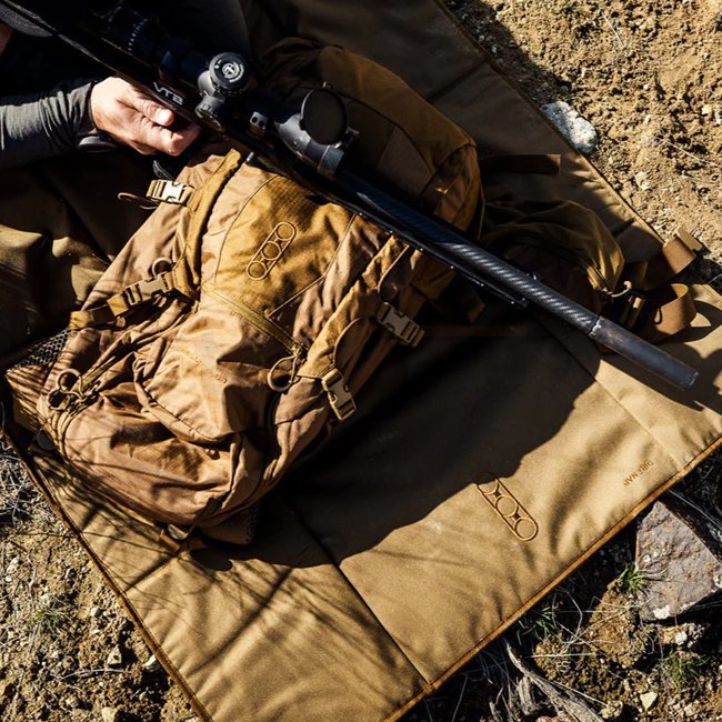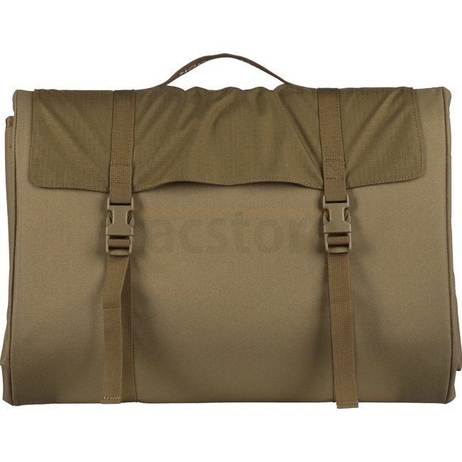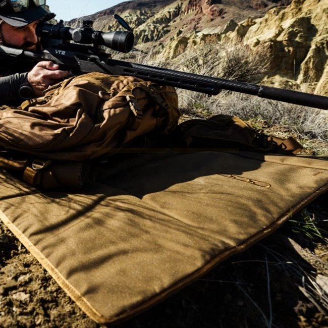 Eberlestock Dirt Nap Shooting Mat - Coyote Brown: Lightweight, foldable mat for prone shooting. Segmented EVA foam padding, durable 600D PVC-coated nylon, integrated carry handle, weather-resistant PVC-coated underside. Dimensions: 239cm L x 86cm W, folde