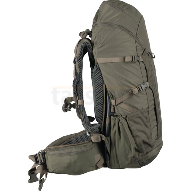 The carrying system includes adjustable shoulder straps, a forward-pull hip belt with zippered pockets, and a padded back panel with ventilation – ensuring comfort and support on long treks.