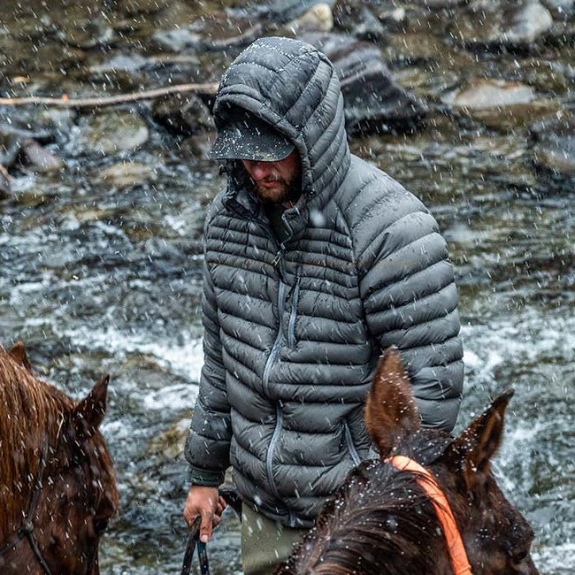 The McCall Hoody is built with 850 fill power grey goose down treated with Granger DWR, providing exceptional warmth while maintaining low bulk and weight. The down insulation ensures superior thermal retention in cold environments without sacrificing mobility.