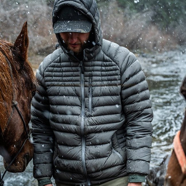 The McCall Hoody is built with 850 fill power grey goose down treated with Granger DWR, providing exceptional warmth while maintaining low bulk and weight. The down insulation ensures superior thermal retention in cold environments without sacrificing mobility.