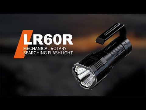 The Fenix LR60R merges a spotlight with flood lighting and delivers up to 21,000 lumens. It has a beam throw of approximately 1,085 meters in spot mode. A mechanical rotary dial enables rapid mode changes, while an OLED screen shows runtime, battery level, and selected mode. It is powered by a replaceable battery pack that can be USB‑C charged.