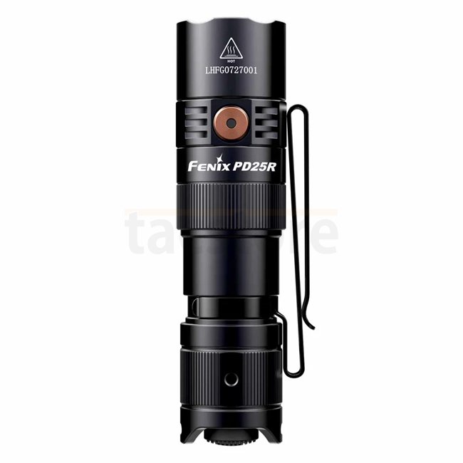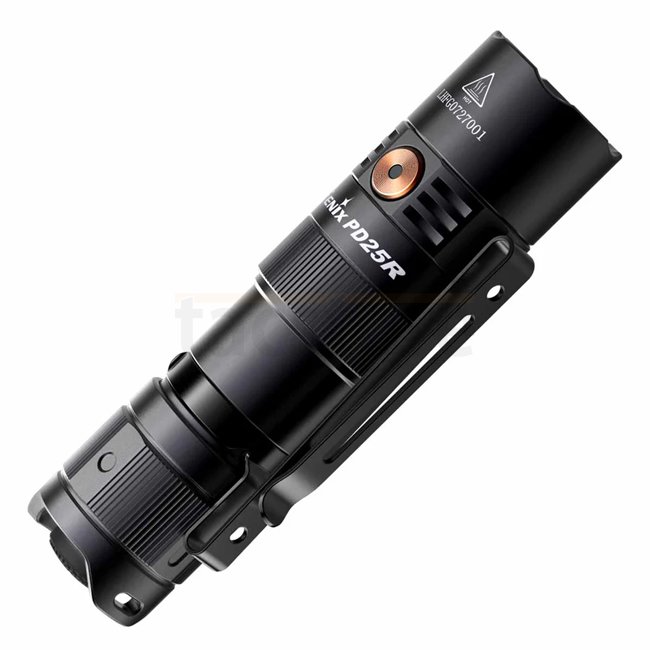 The Fenix PD25R delivers up to 800 lumens with a beam reach of 250 m. It uses a supplied 16340 Li‑Ion battery and optionally accepts a CR123A. Charging is via a concealed USB‑C port. Dual tail and side switches allow momentary / constant output and six modes. It is rated IP68 for dust and water resistance.