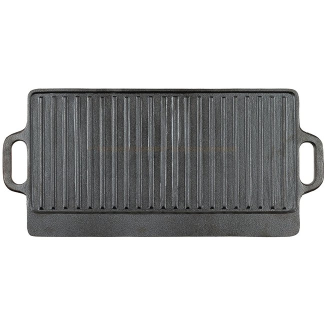 Cast iron griddle with reversible cooking surfaces, smooth side with drip tray and ribbed grill surface. Includes 2 handles. Dimensions: 50 x 23 x 1.5 cm. Made of 100% cast iron. Perfect for indoor and outdoor cooking.