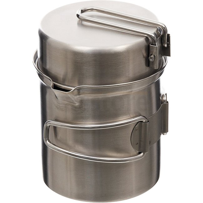 All parts stackable into one another consists of: 1 pan ca. 12 x 4 cm, ca. 300 ml with foldable handle usable as lid 1 pot ca. 12,5 x 12,5 cm, ca. 1,125 l with measuring scale inside up to 1 l and foldable handle Pack size: ca. 16 x 14 cm (Di x H) Weight: ca. 420 g