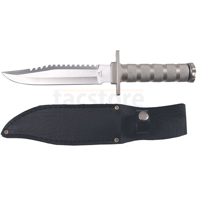 FoxOutdoor Survival Knife - Silver: Blade with smooth edge and saw back, hollow handle with waterproof screw cap, mini compass, survival kit, artificial leather sheath.