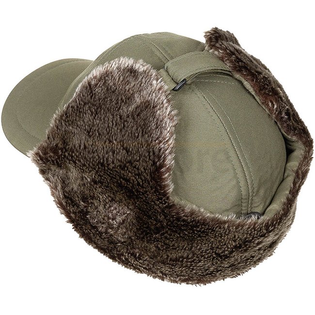 FoxOutdoor Trapper Winter Cap in Olive with earflaps, visor, and faux fur details. Adjustable drawstring with stopper at the back and fleece lining. Made of 100% polyester.