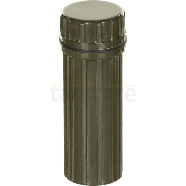 FoxOutdoor Waterproof Survival Box in Olive color, featuring a shockproof plastic design with a screw cap and integrated mirror. Contains 6 matches, 1 striking surface, 1 fishing line, 1 hook, and an integrated fire starter. Dimensions: 8 x 2.7 cm externa
