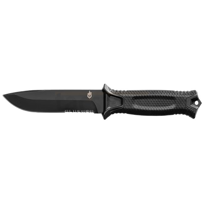 The Gerber StrongArm Serrated Edge - Black is a rugged and durable survival knife perfect for outdoor adventures. Featuring a 127mm blade made of 420HC steel, a rubberized handle for a secure grip, and weighing only 204g, this knife is your reliable compa