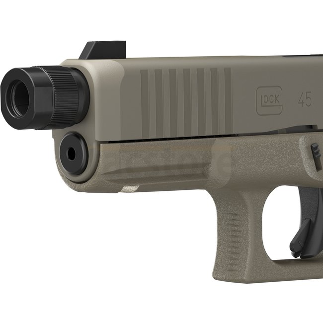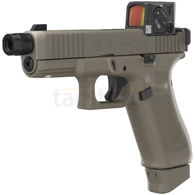 The Glock 45 MOS Hunter Edition is a 9mm Luger crossover pistol that combines the full-size frame of the Glock 17 with the compact slide of the Glock 19. This special edition comes equipped with a COA optic, a GTL II tactical light, an olive-green finish, a threaded barrel, and an extended floor plate. The Modular Optic System (MOS) configuration allows for easy mounting of optical sights without the need for a new slide or separate mounting system.