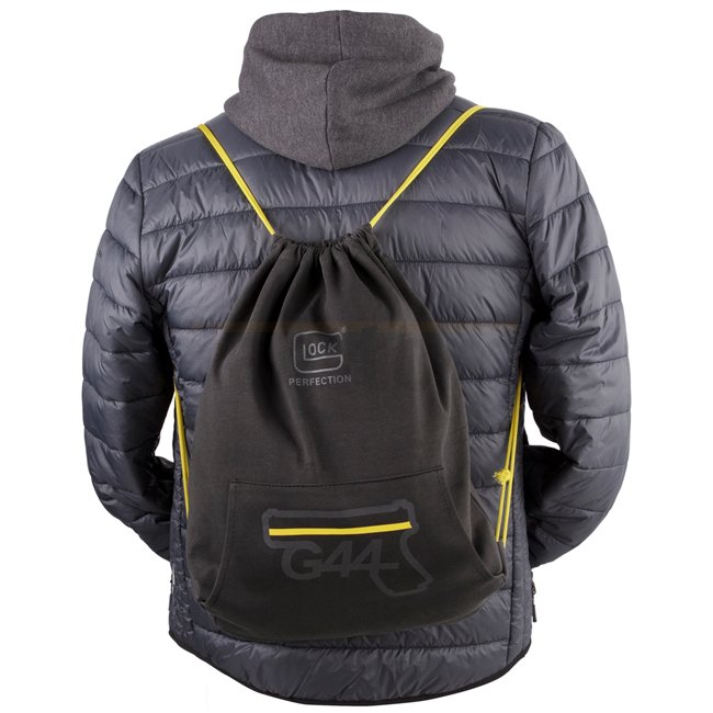 The GLOCK G44 drawstring gym bag combines high-quality materials with a practical design. Made from 100% cotton jersey and measuring approximately 38x46 cm, it provides ample space for essentials. Its dark grey color is accented by yellow polyester cords, while the GLOCK Perfection and G44 logos on the front add a distinctive touch. A small front pocket offers convenient storage for smaller items.