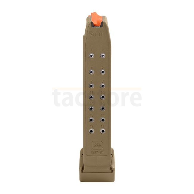 Enhance your Glock 19X with this 19-round magazine, featuring a +2 extended base plate and a high-visibility orange follower for increased capacity and reliable performance during shooting sessions.