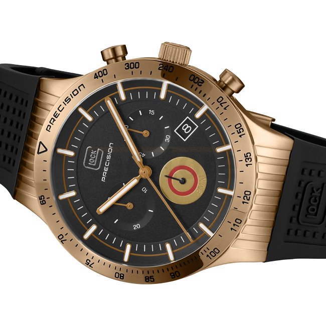 The coyote-tone stainless steel case complements a modern, black silicone strap with GLOCK's RTF texture. The black dial, featuring the distinctive bullet casing detail, displays hands and indices with Swiss Super-LumiNova® for improved readability even in challenging lighting conditions. Driven by a reliable Swiss movement, equipped with a chronograph function, and featuring a 20 ATM water-resistance rating, this watch presents both functionality and style.
