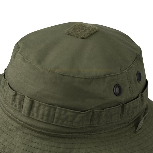 The upgraded Boonie Hat Mk2 is a military-style lightweight hat that dries quickly, with improved features like mesh eyelets, reflective inner material, and a loop for attaching to the Raid shirt. Made of 50% Polyester, 48% Cotton, 2% Elastane. Weighs 124