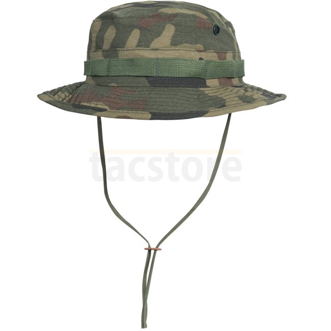 Helikon-Tex Boonie Hat PolyCotton Ripstop in PL Woodland XL. Traditional military hat with wide brim for forest and desert operations. Provides sun and rain protection with detachable neck cover. 60% Cotton, 40% Polyester, 136g. Breathable, lightweight fa