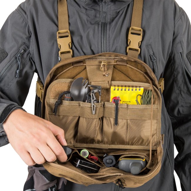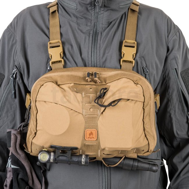 Helikon-Tex Chest Pack Numbat - Crimson Sky / Black: Minimalistic harness with mesh back panel, elastic pockets, MOLLE/PALS mounting points, internal organizer, VIS® compatibility, map pocket, 90 degree opening angle. 19.5 x 28 x 6 cm, 500D Cordura®, 490g