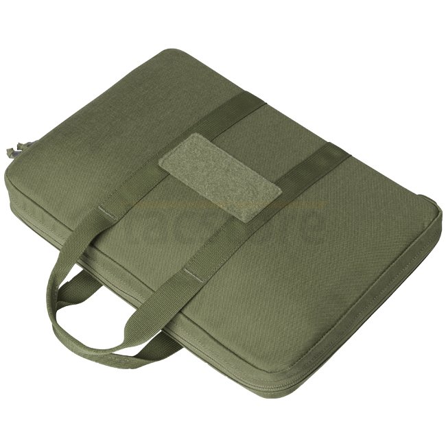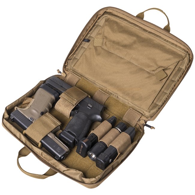 Military-inspired Helikon-Tex Double Pistol Wallet in Olive with Cordura fabric, Velcro ID panel, YKK zipper. Size: 325 x 230 x 35mm, Weight: 555g. Accessories in pictures not included.