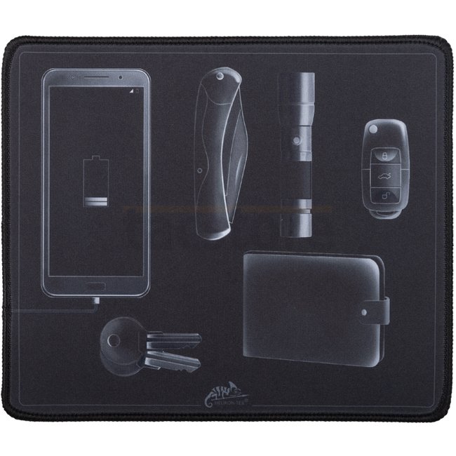 Helikon-Tex EDC Utility Mat - Black: Lightweight, easy to clean, with printed guide. Dimensions: 25.5 x 21.5 x 0.3 cm. Weight: 96 g. Made of neoprene.