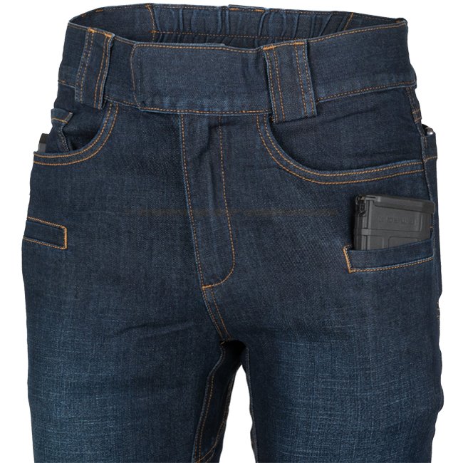 Helikon-Tex Greyman Tactical Jeans Slim in Denim Mid Dark Blue, 2XL Regular. Slim version of popular tactical jeans with crotch gusset for ease of movement. Elastic belt with hook&loop closure, 9 pockets for essentials.