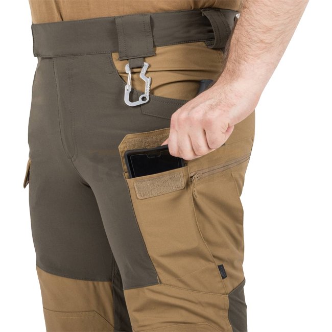 Comfortable and durable Helikon-Tex Hybrid Outback Pants in Taiga Green / Black, M - XLong size. Waterproof with wax, reinforced pockets, and knee reinforcements.