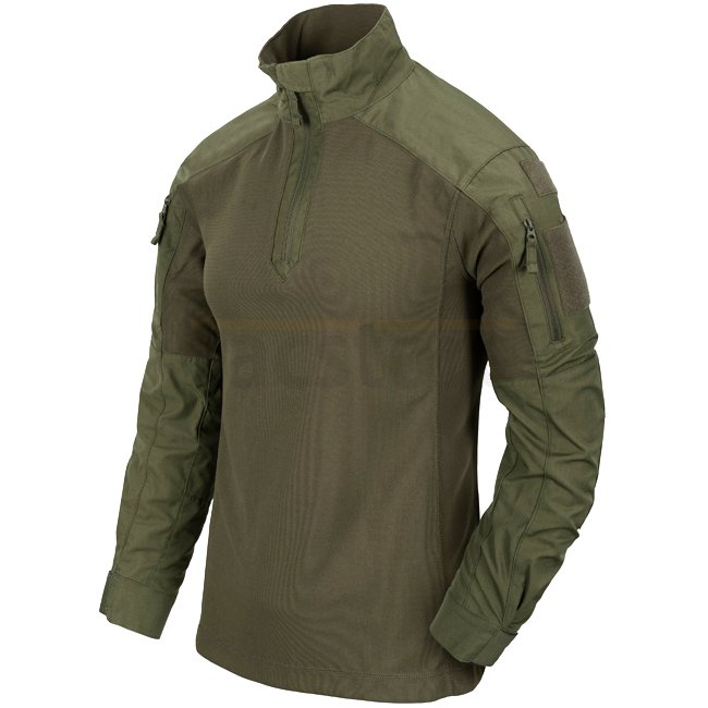 The Helikon-Tex MCDU Combat Shirt NyCo Ripstop in Olive Green is a lightweight and breathable shirt designed for dynamic operations. Made with durable NYCO fabric sleeves and a breathable TopCool fabric torso, it features zippered pockets on the sleeves a