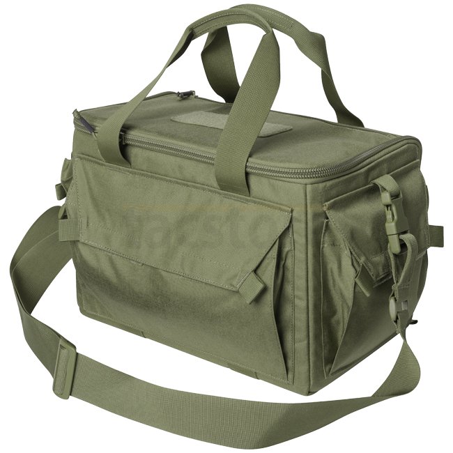 Helikon-Tex Range Bag in Olive color, made of durable Cordura fabric with 18L capacity. Featuring a main compartment with velcro lining, YKK zippers, and dimensions of 350x255x200mm. Weighs 1930g. Accessories in the pictures not included.