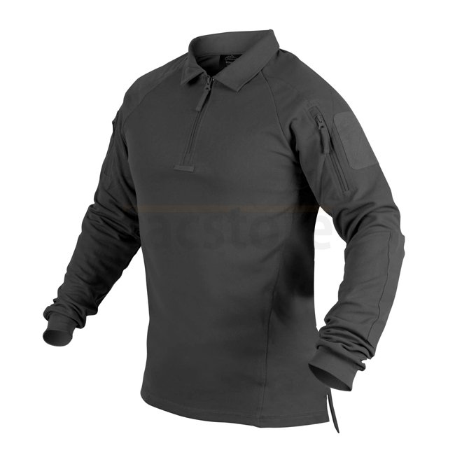 Helikon-Tex Range Polo Shirt in Black, size XL. Quick-drying fabric with VersaStretch side panels for protection from wear and tear. Elbow area with internal pockets for protective pad inserts, mesh in armpits, loop panels for personalization, zippered sl
