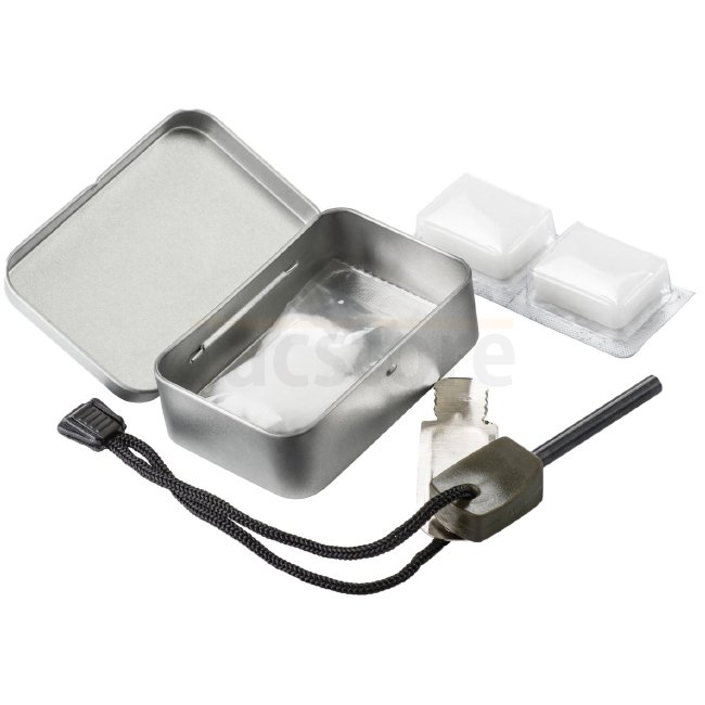 • Set includes: steel survival box (dimensions: 93 x 62 x 27 mm), a fire starter with a striker, two fuel tablets and cotton wool