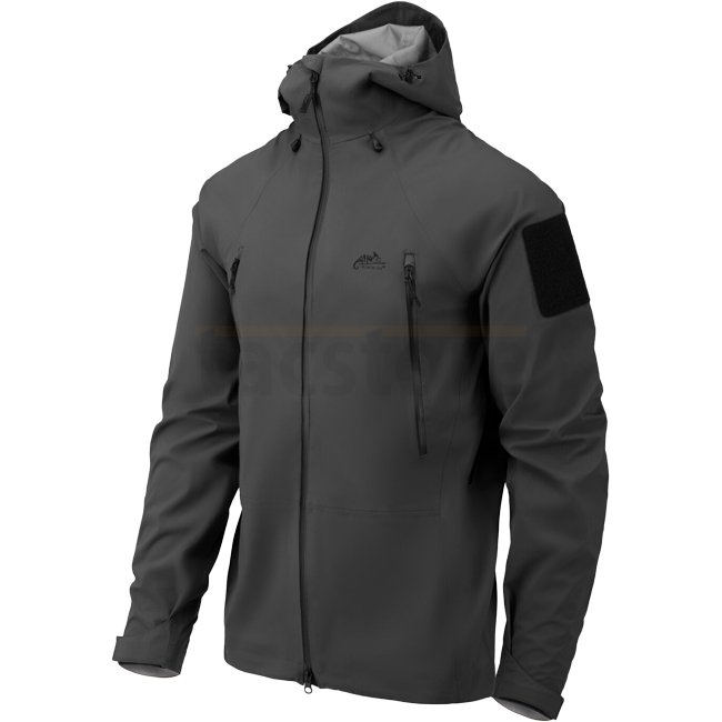 The Helikon-Tex Squall Hardshell Jacket in Shadow Grey XL is a premium rain jacket made of three-layer TorrentStretch® membrane with a 30,000 mm water column, featuring taped seams, dual-adjustable hood with a high collar, and YKK® AquaGuard® zippers.